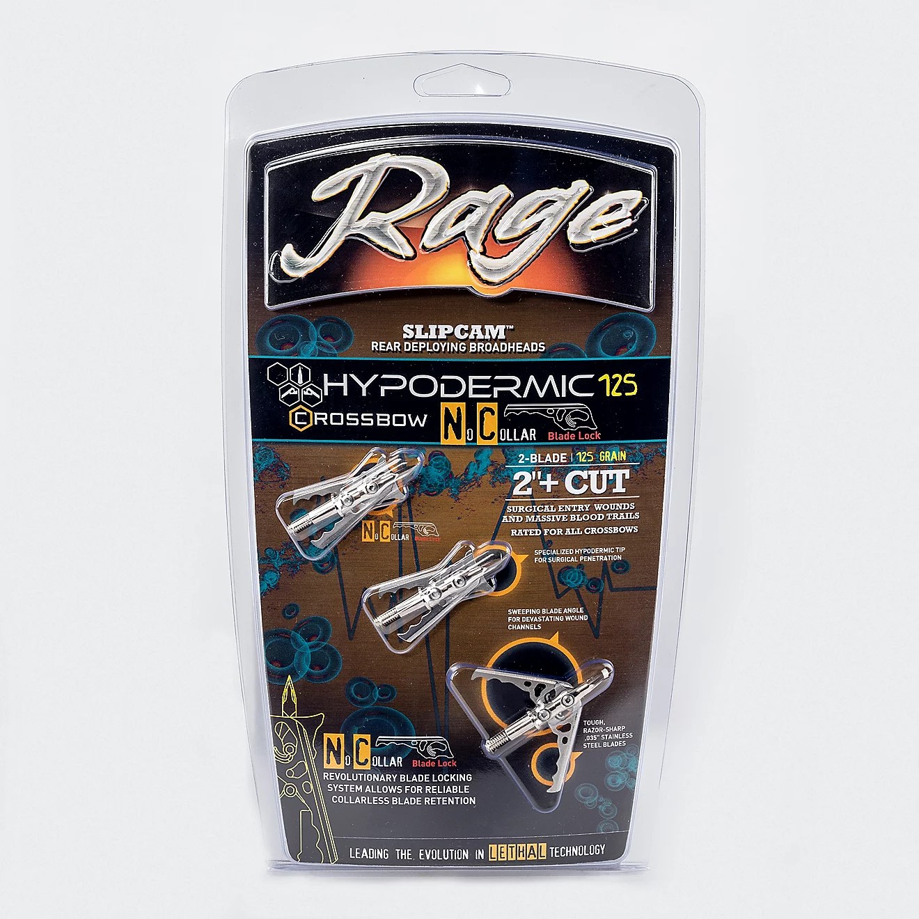 Track your target quickly with the RAGE Hypodermic Crossbow NC 125-Grain Broadhead Arrows 3-Pack. Constructed with machined stainless steel ferrule, these arrows afford durability, while the Hybrid Hypodermic tips deliver increased accuracy. The .035-inch blades deploy on impact, leaving 2-inch cutting diameter that creates wide entry holes, and the finger-like tabs on the Slip Camâ„¢ pivot point provide a secure lock.
